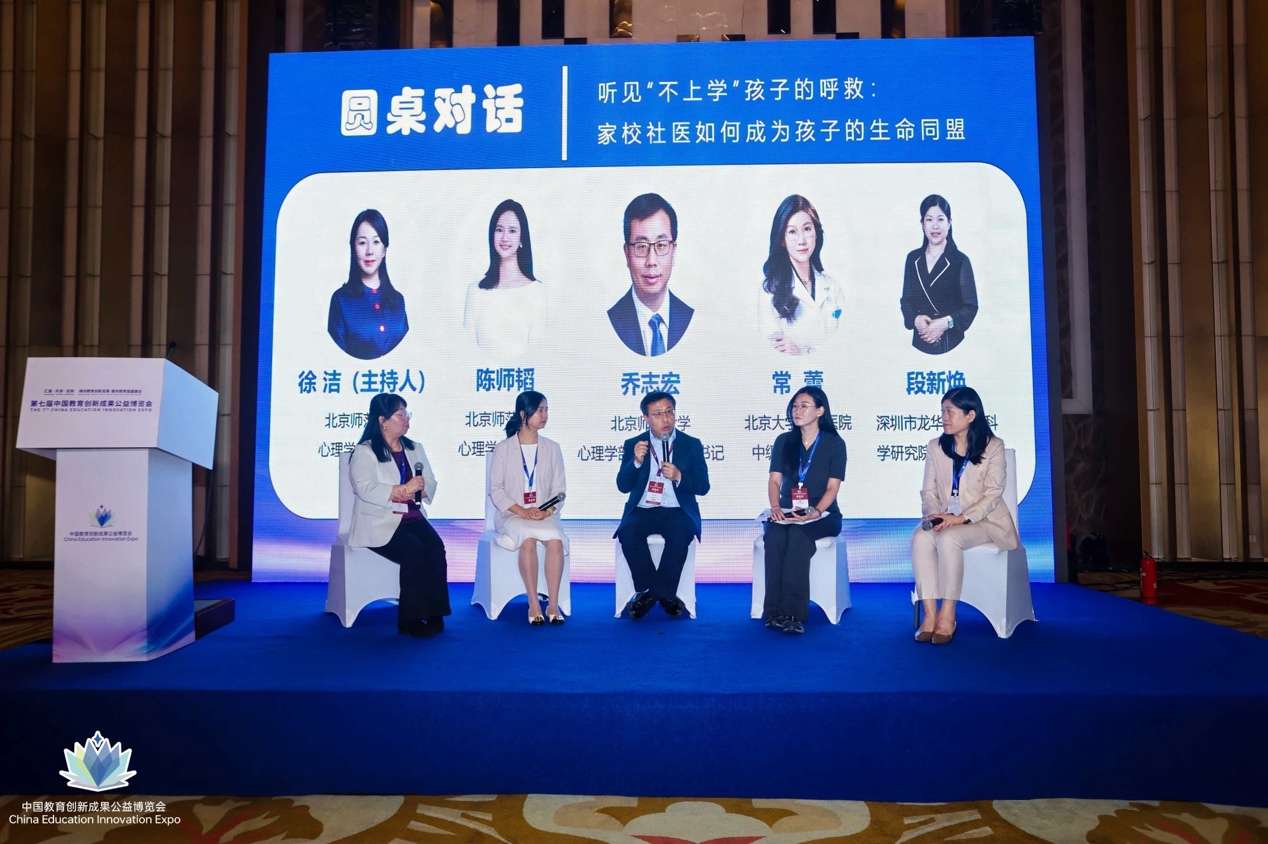 圆桌论坛环节,在北京师范大学心理学部副教授、应用心理专业硕士临床与咨询心理方向北京负责人徐洁的主持下,乔志宏、陈师韬、常蕾,以及深圳市龙华区教育科学研究院心理教研员段新焕围坐一堂,围绕“听见‘不上学’孩子的呼救:家校社医如何成为孩子的生命同盟?”主题展开深度对话。专家学者结合在各自领域的洞见与思考,畅谈如何识别孩子的“无声”呼救、如何建立有效的联动机制、如何化解家校医社沟通的壁垒,以及如何在实际操作中形成合力等核心问题。思想的碰撞激发出智慧火花,为现场观众带来了深刻的启示。