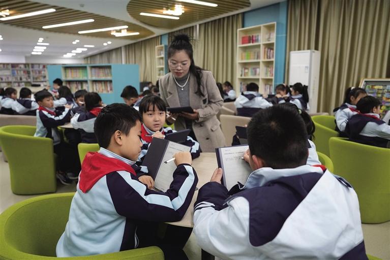 3月17日,学生在湖南湘江新区雷锋小学使用智慧电子阅读终端上阅读课。 近年来,湖南湘江新区雷锋小学将智慧教育场景与基础学科、艺体学科、特色教学领域等深度融合,让人工智能化身教学助手、学习伙伴。学校共配备了50多间智能教室,创设20多类人工智能教育场景,使课堂更高效、学习更生动,以数字化转型助力基础教育高质量发展。 新华社记者 薛宇舸 摄